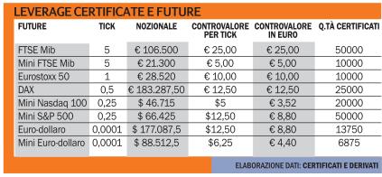 In tale ottica diviene quindi necessario conoscere non solo il nozionale di riferimento dei classici future sui principali indici azionari, ma anche quanti leverage siano necessari per replicare totalmente l’esposizione.  In tal modo, tramite una semplice proporzione, partendo dal controvalore della propria esposizione lineare, è possibile risalire all’esatto numero di strumenti a leva da acquistare per coprire la propria posizione, come mostrato nella tabella “ Leverage Certificate e Future”.