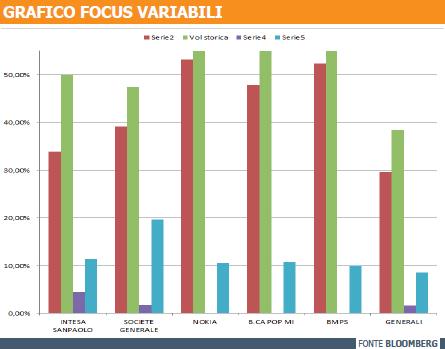 Per quanto detto in precedenza, prima di vedere nel dettaglio le emissioni, è doveroso aprire una parentesi sulla struttura opzionale implicita al certificato. La presenza di un’opzione put esotica di tipo down&out rende lo strumento particolarmente sensibile ai movimenti della volatilità del relativo sottostante, in maniera inversamente proporzionale. Pertanto si comprende come i rendimenti potenziali più elevati siano associati a quei sottostanti maggiormente volatili e pertanto considerati più rischiosi. E’ utile ricordare come il basso costo in fase di strutturazione per tale opzione, che ne massimizza i rendimenti potenziali, sia infatti connesso alle possibilità che la barriera possa venir o meno infranta alla scadenza. Puntualizzando, una maggiore volatilità è sintomo di un’ampia dispersione dei rendimenti, il che rende possibile anche il totale azzeramento del buffer che distanzia gli attuali corsi dal livello invalidante.