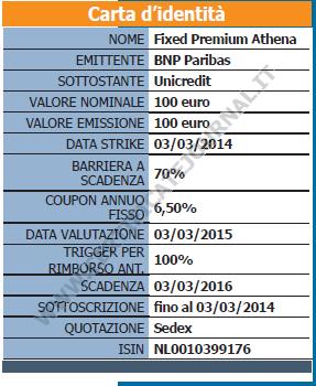 Legato all’andamento del titolo Unicredit e identificato da codice Isin NL0010399176, il Fixed Premium Athena si presenta agli investitori con una prospettiva di rendimento cedolare già quantificabile in partenza, pari cioè al 6,5% annuo, e conseguibile a prescindere dalla quotazione del sottostante. Incerto è invece il profilo di rimborso alla scadenza dei due anni, al termine dei quali sarà il livello assunto da Unicredit a determinare la restituzione o meno del nominale. Più in particolare, a partire dallo strike iniziale che verrà fissato il prossimo 3 marzo l’emittente calcolerà ad una distanza del 30% verso il basso – ovvero al 70% – un livello barriera che qualora non violato alla scadenza del 3 marzo 2016 darà diritto a ricevere il rimborso dei 100 euro nominali; viceversa farà scattare il rimborso “ a benchmark”, agganciando il valore di liquidazione all’effettivo andamento dell’azione a partire dallo strike iniziale. In ogni caso, sia al termine del primo anno di investimento sia alla scadenza naturale – ove non sia intervenuto prima il rimborso anticipato – il certificato pagherà una cedola fissa di 6,5 euro, interamente compensabile con eventuali minusvalenze azionarie pregresse in virtù della mancata garanzia del rimborso del nominale alla scadenza. Prima di arrivare alla fine dei due anni, tuttavia, qualora alla data del 3 marzo 2015 la chiusura di Unicredit risulti non inferiore allo strike iniziale il certificato si estinguerà automaticamente liquidando i 100 euro – più la cedola – ai propri possessori.